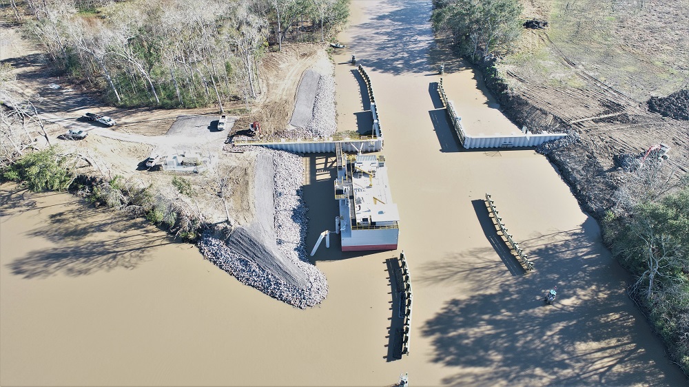 - Construction and installation of a levee (to EL. 10.0’) which extends from HWY 87 to the floodgate with a turnaround and generator pad at the floodgate structure