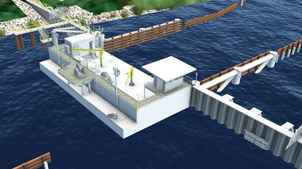 - Construction of steel receiving structure (to EL. 12.0’) consisting of braced steel frame (jacket) on vertical pipe piles, cutoff walls and landing piles to support the gate in the closed position. Clear opening of 75’ to be provided.